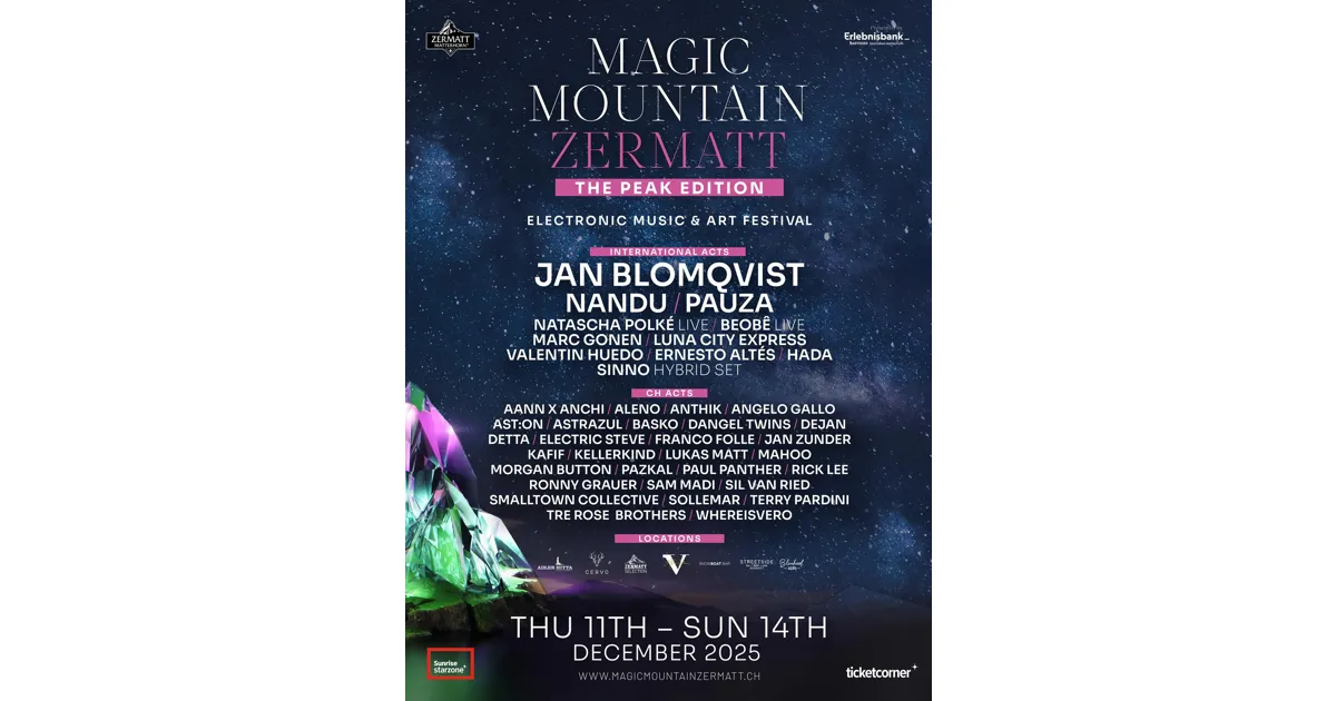 Magic Mountain Zermatt – die zweite Welle rollt an. Nach einer ausverkauften Premiere kehrt das Festival für elektronische Musik und zeitgenössische Kunst zurück – lauter, bunter und mit noch mehr Magie. Tauche ein in ein Wochenende auf 1'600 Metern über Meer, wo satte Bässe auf alpine Freiheit treffen und internationale DJs die Berge zum Beben bringen. Kunst trifft Klang, Schnee küsst Sommerfeeling – und du bist mittendrin.